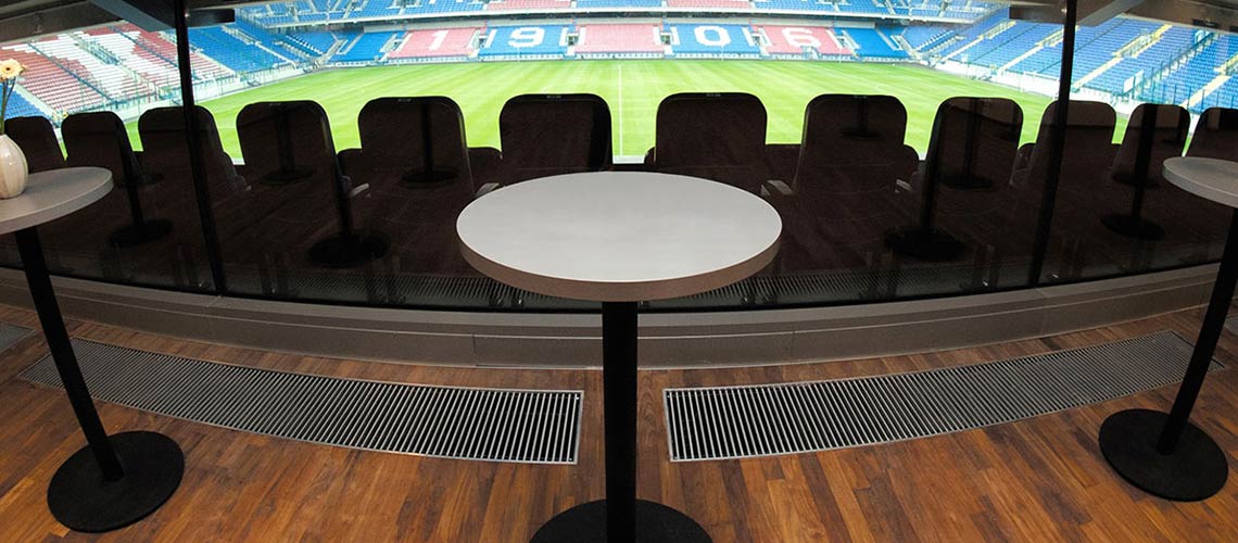Якщо говорити про зимову пору, потрібен внутрішньопідлоговий конвектор, щоб прогрівати приміщення. З його допомогою створюється завіса з тепла, тому холодне повітря не здатне проникнути через великі скляні фасади усередину приміщення. Крім того, внутрішньопідлоговий климаконвектор відрізняється гарною тепловою потужністю. Подібний варіант конвектора чудово впорається з великою площею і зможе рівномірно її прогріти.